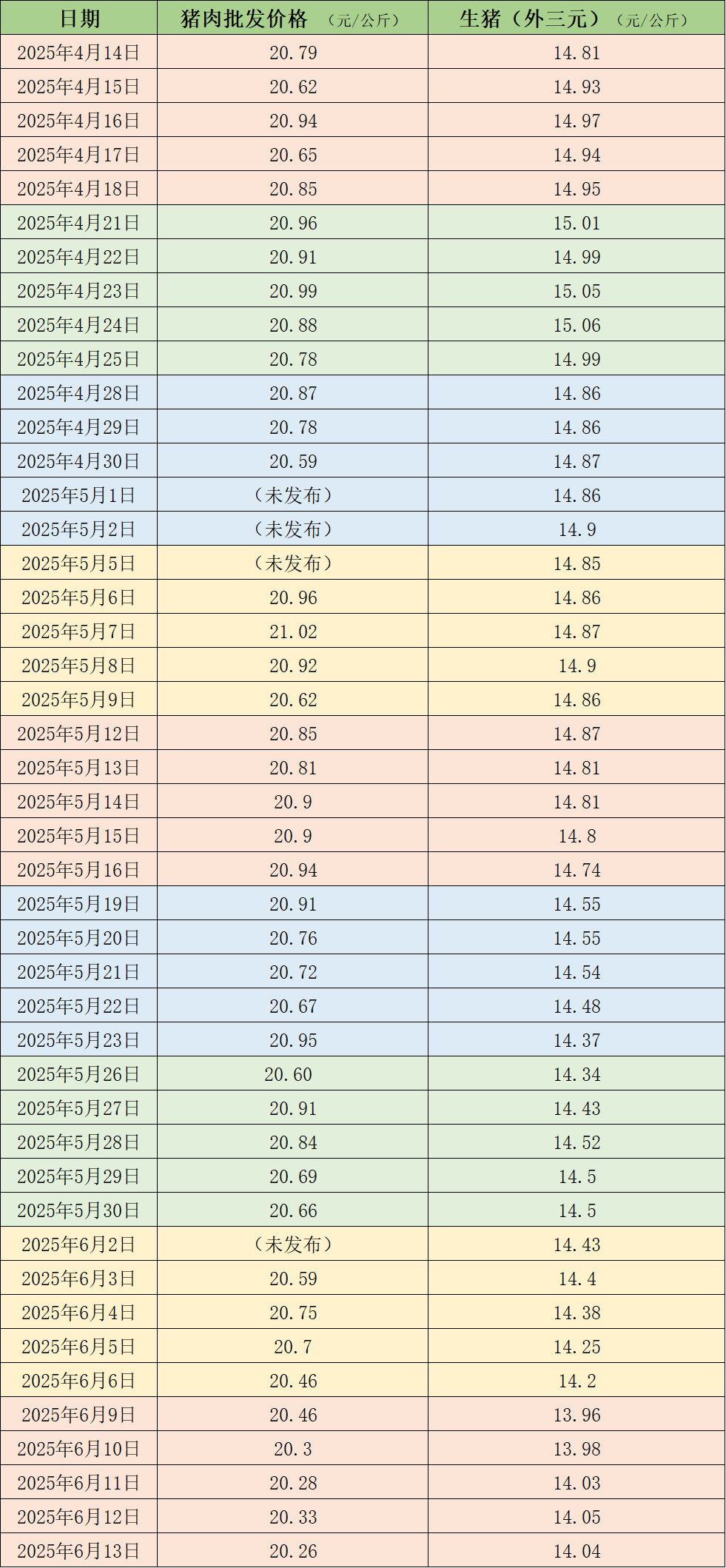 据农业农村部监测,6月13日,全国农产品批发市场猪肉平均价格为20.26元/公斤智慧财讯,与上周五(6月6日)的20.46元/公斤相比,下降1%。本周的平均价格为20.33元/公斤,与上周20.63元/公斤的均价相比,下降1.5%。
