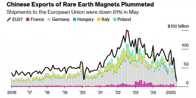 报道称,近几个月来,中国稀土磁铁出口大幅下滑,全球汽车及其他高科技产品供应链因此受阻,欧洲受到的影响尤为严重。尽管中国承诺加快审批速度,但在欧洲,稀土短缺问题依然持续存在。