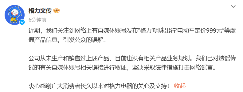 格力电器:从未生产和销售过所谓“999元‘明珠出行’电动车”格力电器:从未生产和销售过所谓“999元‘明珠出行’电动车”