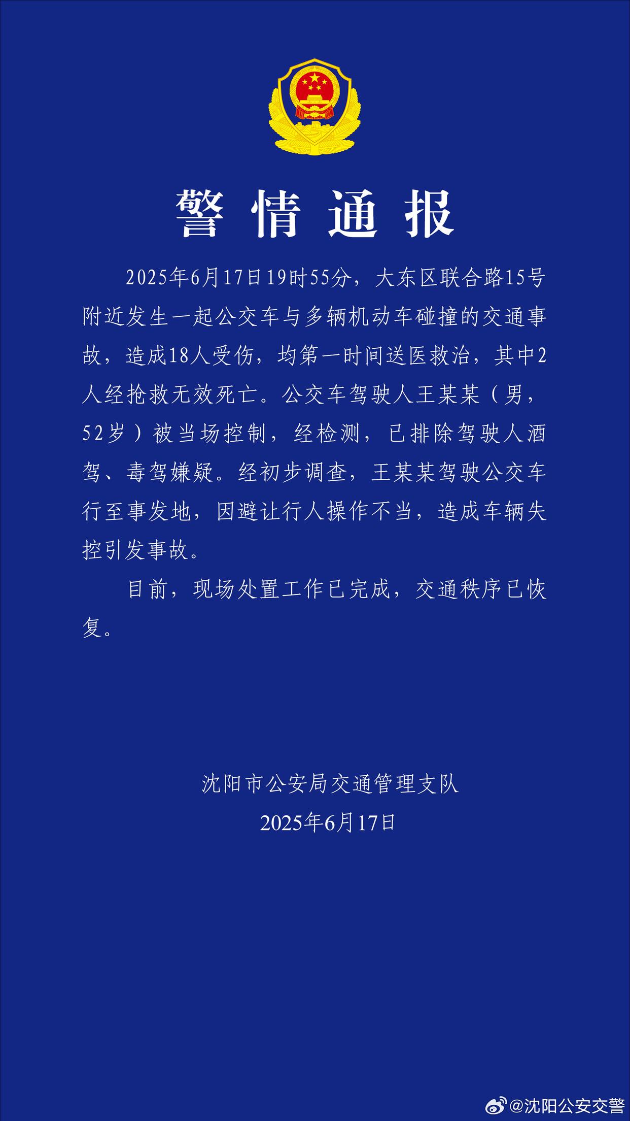 19时55分,大东区联合路15号附近发生一起公交车与多辆机动车碰撞的交通事故,造成18人受伤,均第一时间送医救治,其中2人经抢救无效死亡。公交车驾驶人王某某(男,52岁)被当场控制,经检测,已排除驾驶人酒驾、毒驾嫌疑。经初步调查,王某某驾驶公交车行至事发地,因避让行人操作不当,造成车辆失控引发事故。