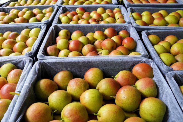 仓库内同样是一派繁忙景象。分拣区,工人先按大小、品相分类挑选,把匀称无瑕疵的果实装进果筐,随后将装好的果筐整齐码放在货车旁,等候发往各地。