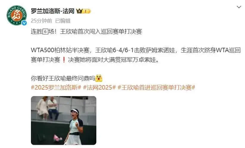 相对而言,法网则调皮了许多,用连赢6场来祝贺王欣瑜,而且在最后还打出提问的话题,王欣瑜是否能问鼎柏林!